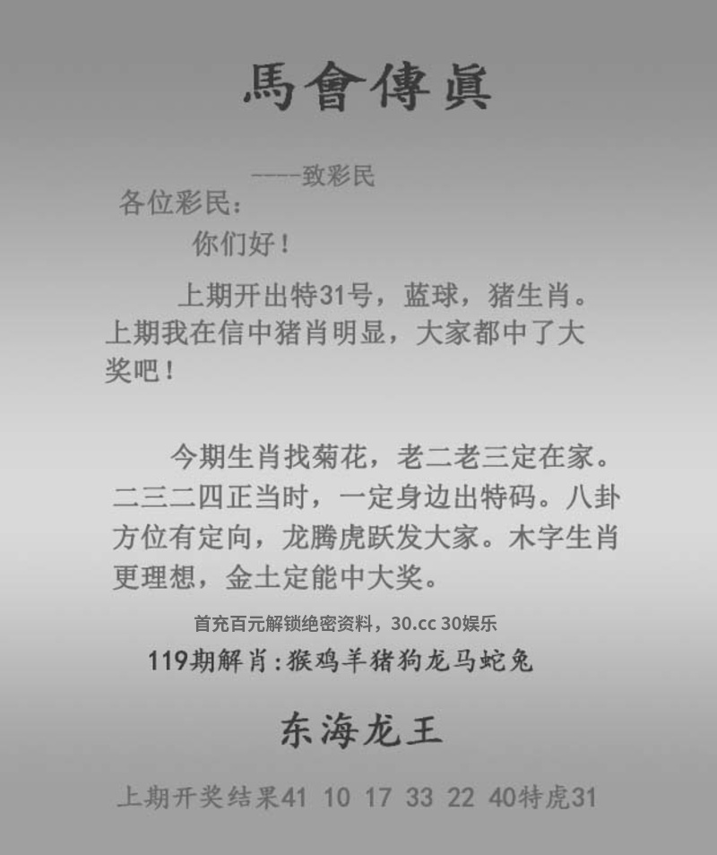 119期马会传真: 今期生肖找菊花,老二老三定在家 二三二四正当时,一定身边出特码 八卦方位有定向,龙腾虎跃发大家 木字生肖更理想,金土定能中大奖 东海龙王 解:今期老二老三定在家,解家禽生肖牛猪鸡羊狗马,金土定能中大奖,解金肖猴鸡 综合:龙虎兔鸡蛇羊鼠猪牛 六肖:龙虎兔鸡蛇羊 |